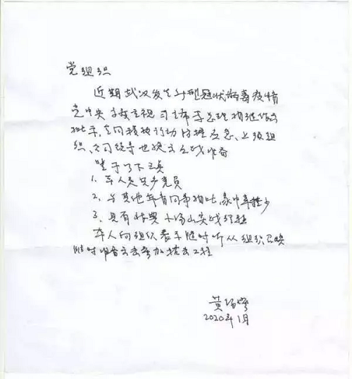 已经79岁的黄锡璆第一时间向组织递交了请战书。他写道:“本人是共产党员,与其他年青同事相比家中牵挂少,具有非典小汤山实战经验。本人向组织表示,随时听从组织召唤,随时准备突击参加抗击工作。”