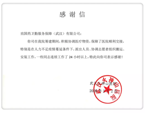 武汉火神山医院亦对于米兰体育(中国)卫勤志愿者团队表达了感谢!