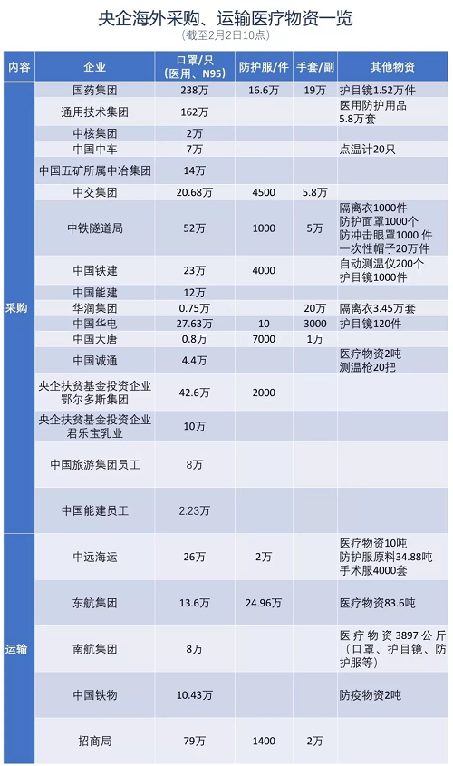 截至2月2日10点,相关央企和央企员工共从海外采购口罩627.09万只,防护服18.45万件,手套51.1万副,医疗物资2吨,手术服、护目镜、防护面罩、帽子、点温计等31.2万套/件/个