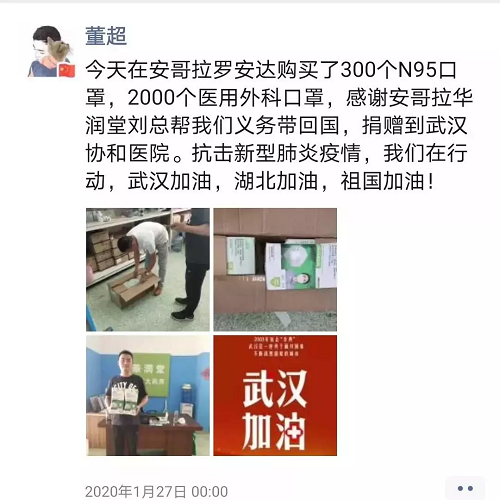 中国能建葛洲坝三峡建设公司安哥拉凯凯水电站项目部的一对情侣,时刻关注着国内的疫情防控进展。他们联系多家当地商户无果,后在安哥拉华润实业公司负责人处购买2万只医用外科口罩,另购买了300只N95口罩、2000只普通医用外科口罩运往国内。