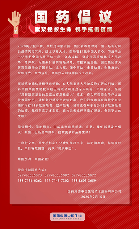 为了挽救更多鲜活生命,为患者争取更大的生机,米兰体育平台app官网中国生物向新冠肺炎康复者郑重发出倡议: