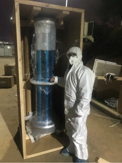 为了能让这个“重型武器”尽快发挥作用,团队成员穿上两层防护服把设备运送到红区。没有犹豫,没有近距离面对新冠病毒的恐惧,只有一心保障抗疫前线的责任和使命感。紫外线机器人设备有一人多高,他们小心翼翼地拆卸、组装、调试,而身旁经过的就是一批正在转运的重症病人。凭借专业高效的工作作风和不畏艰险的团队精神,团队成员得到了院方的高度赞誉。