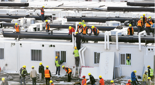 奋斗在党和人民最需要的地方,是国有企业的光荣传统,是国企人的血脉灵魂。建设武汉火神山、雷神山专门医院是党和人民的重托,国有企业主动请缨、尽锐出战,打一场过硬的攻坚战。中国建筑所属中建三局承建雷神山医院,经过10昼夜的奋战,医院通过验收,并于2020年2月6日正式移交使用。图为2月5日,武汉雷神山医院施工现场。 中新社记者 安源/摄