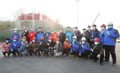 2月20日,被授予“雷神山医院荣誉员工”的中建三局、中南建筑设计院等参建单位员工在雷神山医院前合影留念。