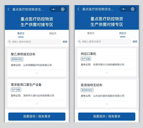 平台充分发挥中央企业上下游生态圈协同优势,调动相关国资国企物资生产技术能力和物资储备库存,并积极吸引社会企业提供疫情防控物资、原材料、生产设备等资源渠道,推动全社会信息广泛共享,实现线上无缝衔接、线下精准对接、高效达成合作,全面助力防疫防护物资生产供应和企业复工复产。