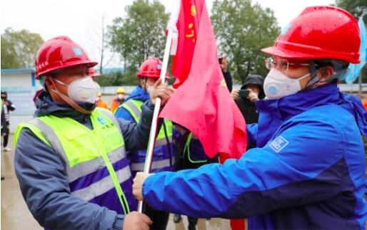 1月25日大年初一,陈卫国(右)为火神山医院项目党员突击队授旗。