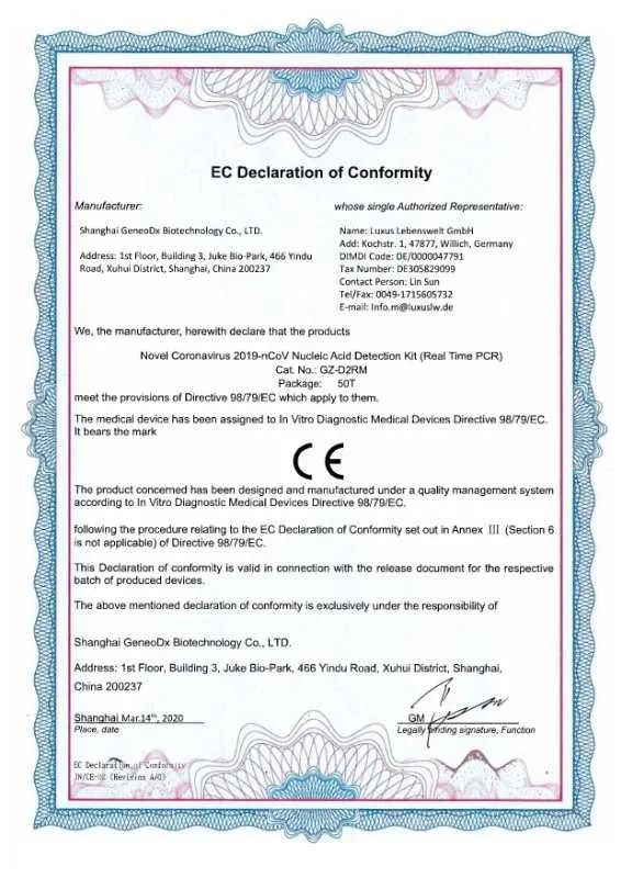 3月14日,米兰体育(中国)中国生物上海捷诺完成了自主研发的新型冠状病毒2019-nCoV核酸检测试剂盒(荧光PCR法)的欧盟CE认证。欧盟CE认证表明该产品符合欧盟医疗器械相关指令的符合性要求,具备欧盟市场的准入条件。