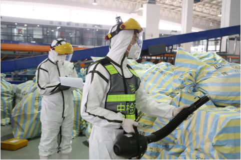 中检集团作为检验检测认证行业的国家队,充分发挥专业技术优势,展现央企责任担当,国内28家分支机构的400多名专业人员严格按照检疫处理标准和卫生处理方案,对机场、港口、码头等场所和工作环境,飞机、船舶等交通工具开展消杀灭等有害生物防治工作,3月12日至今,机场口岸进境航空器检疫处理230架次飞机客舱、货舱消毒,邮政口岸消毒进境邮件124866件,邮件分拣现场消毒面积近200万平方米;铁路口岸集装箱消毒13箱(40尺),郑欧班列集装箱消毒205箱(40尺)。