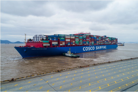 两万箱超大型集装箱船“中远海运白羊座”轮正驶离宁波港。