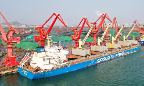 中远海运衢山海轮55000吨几内亚铝土矿在日照港卸货。