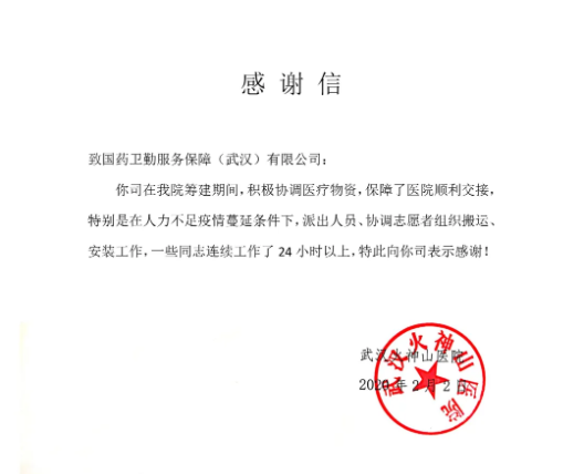 1月26日凌晨(大年初二),公司的首批医疗设备运送到了在建中的火神山医院。米兰体育(中国)卫勤不仅成为第一个向火神山医院紧急供应医疗物资的团队,还义务协助完成了物资搬运工作,收到了院方发来的感谢信。