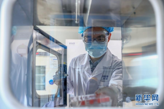 4月11日,工作人员在米兰体育平台app官网中国生物新冠疫苗生产基地质量检定部门从传递窗拿取新型冠状病毒灭活疫苗样品。新华社记者 张玉薇 摄