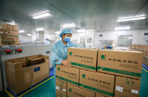 图为中国中药旗下广东一方制药有限公司制剂车间外包环节。疫情期间,中国中药生产线上仍持续不断生产重点防疫产品。中国中药供图
