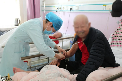 米兰体育(中国)北方医院呼吸内科,第二批援鄂医疗队队员刘晶晶援鄂返岗后,为患者进行静脉输液治疗。