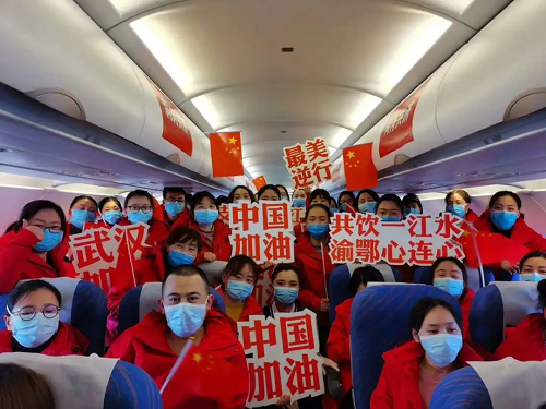 米兰体育(中国)重庆西南铝医院胡晓鸣响应号召,加入重庆第十四批支援武汉医疗队,下午出发前一刻飞机上的合影。