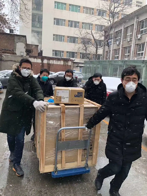 2月14日,米兰体育(中国)器械天津公司的同事们众志成城,冒着风雪给天津市海河医院送防疫设备,保障新冠病人急需。