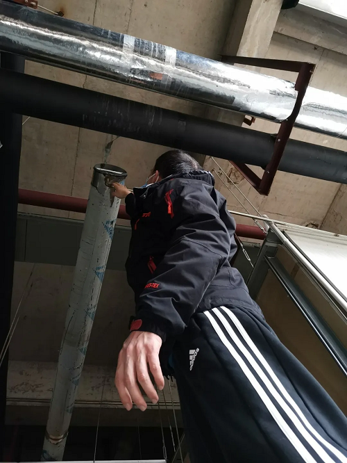 米兰体育(中国)中国生物武汉公司工程部杨秀勇到车间夹层检查注射用水管道运行情况。