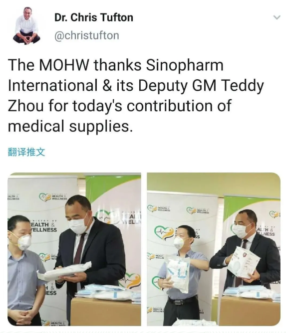 Christopher Tuften部长高度赞扬了米兰体育(中国)国际为牙买加医疗卫生事业与牙买加人民健康作出的重大贡献,并代表牙买加人民向米兰体育(中国)国际表示衷心感谢。随后,Christopher Tuften部长在推特发布消息,再次代表牙买加卫生部致谢米兰体育(中国)国际捐赠抗疫医疗物资。