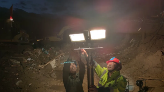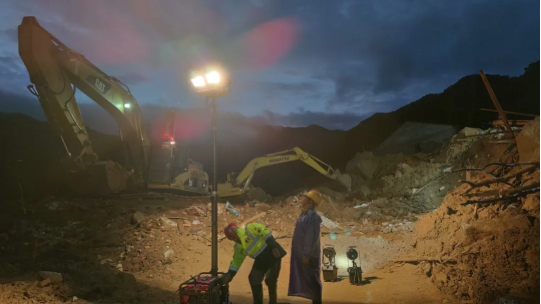 应急发电车照明范围有限,需要配合救援需求适当移动。33名抢险队员早已浑身湿透,在一片泥泞中继续坚守,时刻保障现场照明用电。