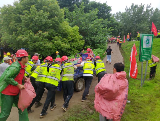 华中大区迅速集结120余名职工,带上雨衣、雨鞋、手电筒、手套、功能饮料、矿泉水等各类防汛保障用品。员工们来不及换下工装、皮鞋就火速赶往现场。
