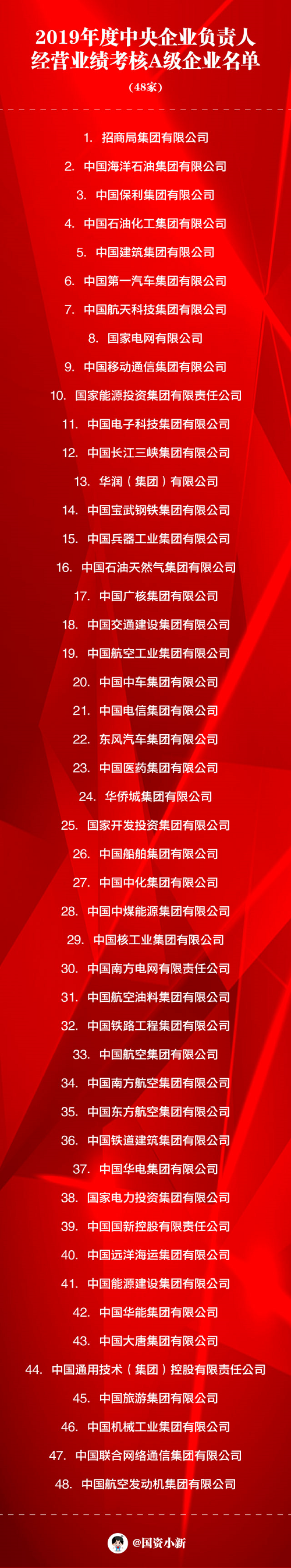 根据《中央企业负责人经营业绩考核办法》,2019年度中央企业负责人经营业绩考核结果已经国资委党委会议审议通过,现将A级企业名单通报如下: