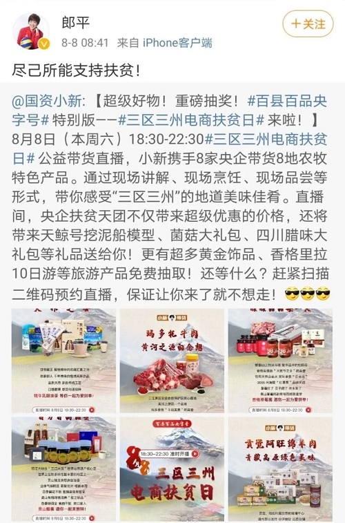 在“三区三州”地区,国资委指导中央企业探索出了各具特色的扶贫路径和模式。此次直播带货中详细展示了中央企业行之有效的经验和做法。