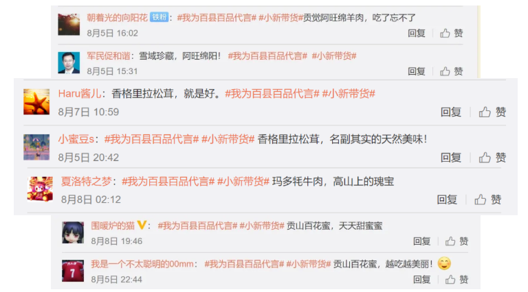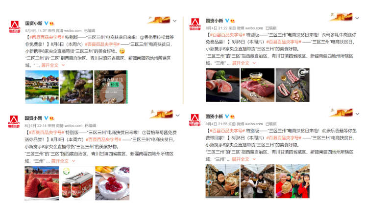 除了农特产品,直播带货还创新加入图片、视频等元素,着重推介“三区三州”的旅游资源。“旅游搭台,扶贫唱戏”,边疆美景和风土人情为此次直播带货增强了文化厚度,为“三区三州”塑造了“美食+美景”的双重地区特色品牌。