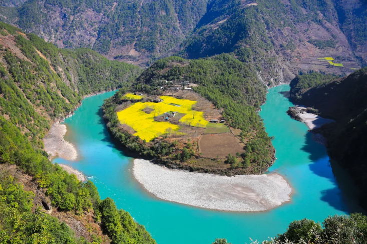 ▲ 怒江,流经云南贡山县丙中洛乡日丹村附近,由于王箐大悬岩绝壁的阻隔,江水的流向从由北向南改为由东向西,流出300余米后,又被丹拉大山挡住去路,只好再次调头由西向东急转,在这里形成了一个半圆形大湾,称为“怒江第一湾”。