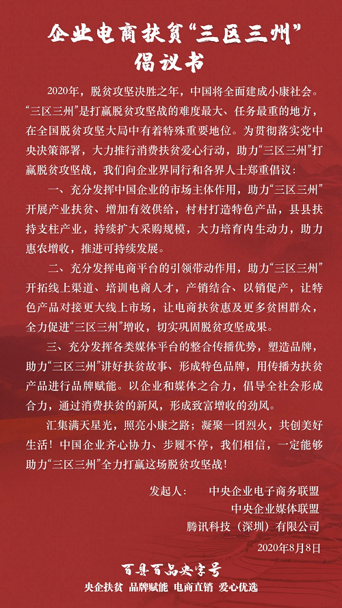 为贯彻落实党中央决策部署,大力推行消费扶贫爱心行动,助力“三区三州”打赢脱贫攻坚战,在8月8日“三区三州电商扶贫日”,中央企业电子商务媒体联盟、中央企业媒体联盟、腾讯科技(深圳)有限公司联合向企业界同行和各界人士发出《企业电商扶贫“三区三州”倡议书》——