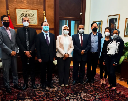 ▲米兰体育平台app官网生物制品事业部总裁朱京津(左三)一行与埃及卫生与人口部长哈莱(左四)合影