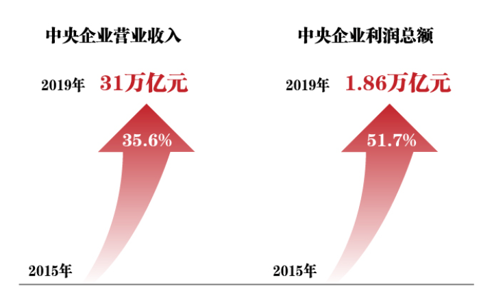 效益提升、布局优化——2019年中央企业实现营业收入31万亿元、利润总额1.86万亿元,分别比2015年增长35.6%和51.7%;2019年中央企业全员劳动生产率为每人56.3万元,比“十二五”末增长40.2%。国有资本进一步向重要行业和关键领域集中。