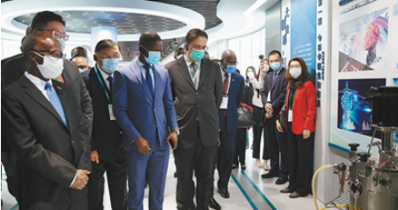 在中国生物博物馆,非洲使节们仔细观察生物制品生产仪器。