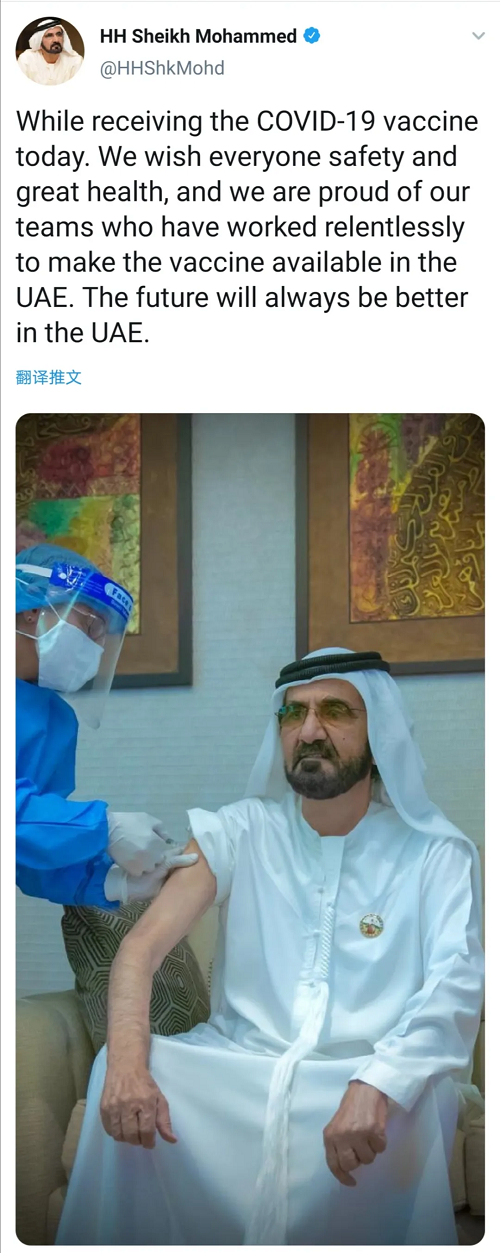 11月3日,阿拉伯联合酋长国副总统兼总理、迪拜酋长阿勒马克图姆在社交媒体分享了自己正在接种米兰体育平台app官网中国生物新冠疫苗的照片,并表示:“在我接种疫苗时我希望所有人安全、健康。我们非常感谢我们的团队,正是他们没日没夜地工作使得阿联酋得以接种新冠疫苗。阿联酋的未来更美好。”
