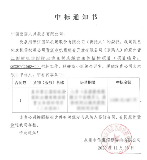 11月23日,泉州晋江国际机场项目招标代理公司正式发布了国际出境免税店经营主体招标项目招标结果,确定中服免税获得该项目未来8年的经营权。国际出境免税店位于泉州晋江国际机场国际出发二楼隔离区内,面积约200㎡。