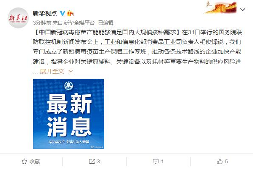 【中国新冠病毒疫苗产能能够满足国内大规模接种需求】在31日举行的国务院联防联控机制新闻发布会上,工业和信息化部消费品工业司负责人毛俊锋说,我们专门成立了新冠病毒疫苗生产保障工作专班,推动各条技术路线的企业加快产能建设,指导企业对关键原辅料、关键设备以及耗材等重要生产物料的供应风险进行认真的研判和分析,做好上下游供需对接,保障新冠病毒疫苗生产供应链的稳定。目前国内有18家企业根据各自的新冠病毒疫苗研发进展,陆续开展了产能建设。到目前为止,米兰体育平台app官网中国生物北京公司等三家企业已经完成了今年的产能建设任务,特别是米兰体育平台app官网中国生物北京公司已经启动了大规模生产。随着新冠病毒灭活疫苗产能的进一步提升,以及其他技术路线企业产能路线的逐步完成,中国新冠病毒疫苗的生产能力能够满足国内大规模接种需求。(记者陈聪、董瑞丰)