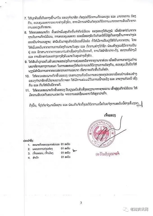 继续关闭国际关口、 当地出入境检查站,老挝公民和获得特别委员会许可急需出入的外国人除外。国际关口的物运输,可以正常进出,但必须按照占巴塞省省长的第04号的附加通知完成。
