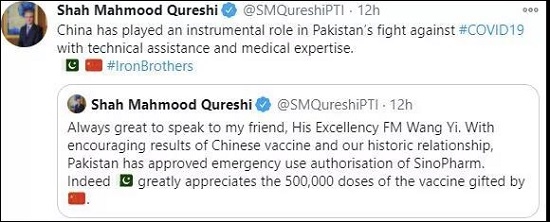 1月21日,国务委员兼外长王毅应约同巴基斯坦外长库雷希通电话。王毅表示,中国政府已决定向巴方提供疫苗援助,并积极协调中国企业加快向巴方出口疫苗。库雷希代表巴政府和人民感谢中国政府决定向巴方提供疫苗援助并提供采购便利。库雷希表示,巴方已批准中国米兰体育平台app官网疫苗紧急使用授权,将积极考虑批准其他中国疫苗市场准入。同一天,库雷希在社交媒体上宣布,中国将向巴基斯坦赠送50万剂新冠疫苗,他们对此表示“非常感激”。