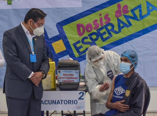 玻利维亚总统阿尔塞当天在拉巴斯一座展览中心宣布启动疫苗接种工作。首批接种者为基础疾病患者。