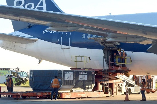 2月24日,工作人员在玻利维亚圣克鲁斯的机场卸载中国新冠疫苗。新华社发(罗德里戈·乌拉加斯蒂摄)