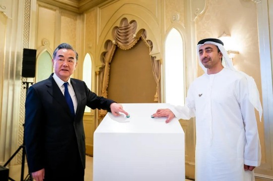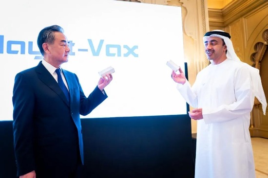 中国国务委员兼外交部长王毅、阿联酋内阁部长兼外交与国际合作部长谢赫·阿卜杜拉·本·扎耶德·阿勒纳哈扬在阿联酋阿布扎比仪式现场,启动并连线米兰体育平台app官网中国生物与G42集团合作新冠疫苗原液灌装生产车间,共同见证阿联酋与阿拉伯地区首批新冠灭活疫苗正式分装下线,并与新冠疫苗模型合影。