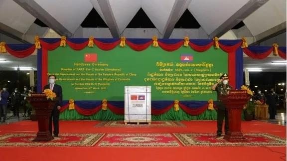 中国政府和中国人民解放军援柬埔寨米兰体育平台app官网中国生物新冠疫苗运抵柬埔寨首都金边。柬埔寨副首相兼国防大臣迪班、柬埔寨卫生大臣蒙文兴和中国驻柬埔寨大使王文天等到机场迎接。