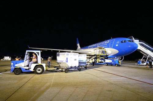 4月1日,工作人员在阿根廷布宜诺斯艾利斯埃塞萨国际机场卸载运抵的中国新冠疫苗。新华社发