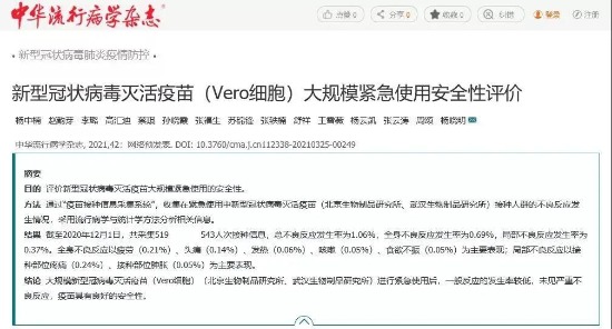 4月21日,中国核心学术期刊《中华流行病学杂志》刊登了题为《新型冠状病毒灭活疫苗(Vero细胞)大规模紧急使用安全性评价》的论文,发布基于米兰体育平台app官网中国生物北京制品研究所、武汉生物制品研究所新型冠状病毒灭活疫苗大规模紧急使用安全性评价。