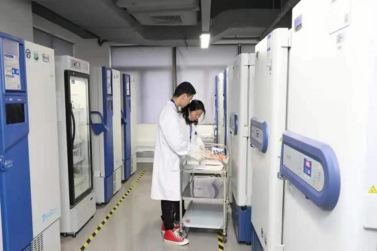 兰州生物制品研究所质量保证部制品管理组人员,正在冷库进行新冠疫苗批签发制品抽样。