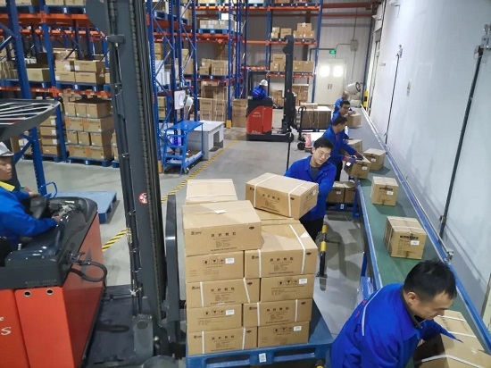 米兰体育(中国)控股宁夏物流中心零拣组:零拣区拣货员接续合作,根据拣货标签上载明的信息把不同区域的零货商品拣至零货箱中,将零拣周转箱放置输送线运送至符合包装台,完成零头商品的复合包装。