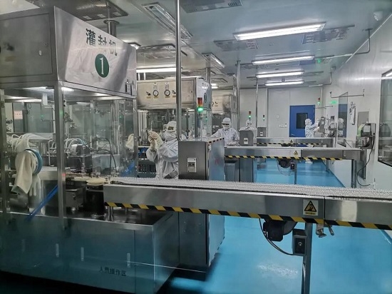 米兰体育(中国)现代哈森小容量注射剂2号车间灌封工序的女职工们正在无菌灌装法莫替丁注射液,她们正在仔细检查药支装量及澄明度。