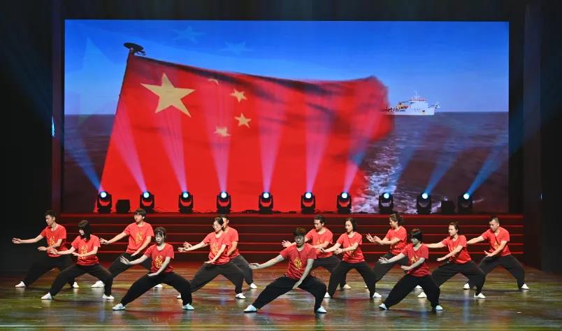 伴随着《祝福祖国》悠扬的合唱歌声,一线车间女职工在舞台上通过队形变化用扇子摆出“不忘初心”“牢记使命”“祖国富强”“人民安乐”等字样,为庆祝建党100周年献上质朴而诚挚的祝福。