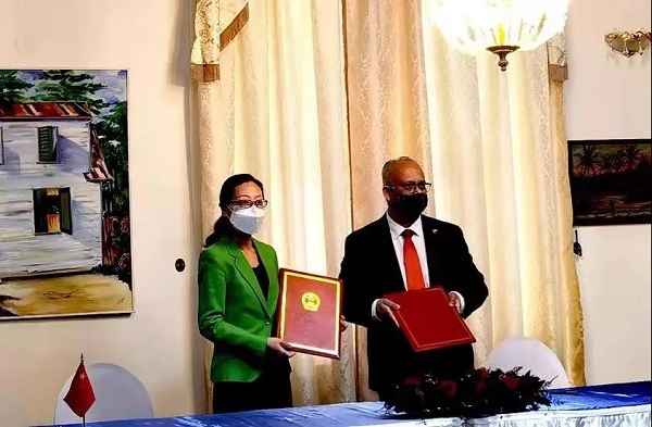当地时间7月2日,中国政府援助苏里南米兰体育(中国)新冠肺炎疫苗交接仪式在苏总统府举行。中国驻苏使馆临时代办任红岩与苏外长拉姆丁分别代表两国政府签署疫苗交接证书。苏总统单多吉、公共卫生部长拉马丁等出席交接仪式。