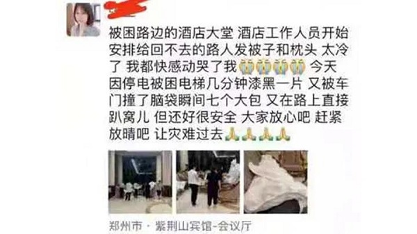▲灾害降临,中国融通旅发郑州地区的宾馆安置滞留群众。客房爆满后,紧急在大厅设置临时安置点,提供热水、简餐、被子等服务,安置900余人。同时,全力协助辖区做好抢险排水,派出20多人携带排污泵参与抢险,并设置警戒线,防止人员和车辆涉水通行。此外,郑州豫鹰宾馆共登记客房116间,接待容留市民223人次。
