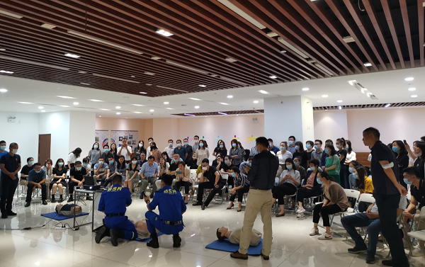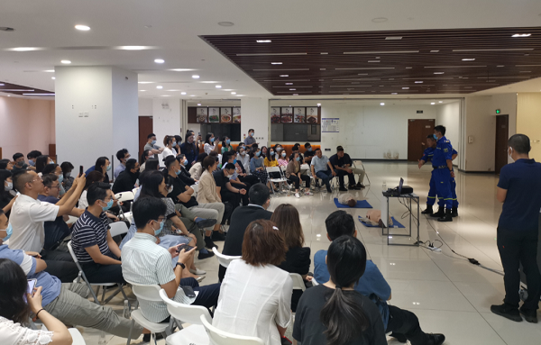 讲座围绕水域避险、防火逃生和日常生活急救展开,内容涉及灾害防护避险、内涝洪水避险、车辆入水自救、防火逃生自救,防护面罩使用、灭火器具使用及CPR心肺复苏、AED使用、电梯遇险、异物梗阻等多个方面。讲座内容丰富实用,涵盖了绝大部分日常工作和生活中遇到的紧急救助情况,不仅有理论知识讲解,还有案例讲解、情景模拟和模型实操演练,特别是胸外心脏按压、开放气道、人工呼吸、海姆立克急救法以及自动体外除颤器AED使用方法,让大家切实掌握了必要的急救避险、救援技巧。